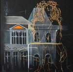 Het werk bestaat uit drie lagen,zwarte achtergrond ,voorstelling van gebouwen, gouden vrouw in lijnen.